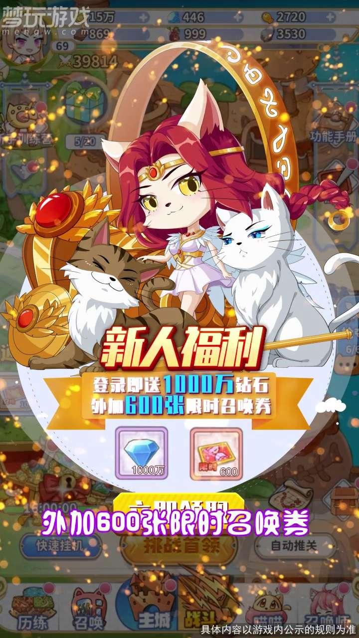 3. 挂机时间猫灵外出旅行,会不时为你带回有爱的照片、特产及小猫;喂养小猫,有机会获得全新猫灵和精美道具。还可以选择课程进行培训、打工,实现和养成体系的结合。