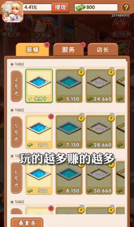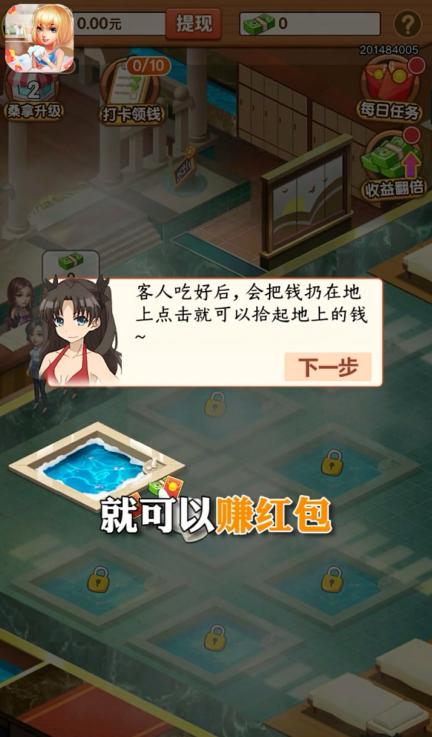 皇上请宽衣红包版其实是一非常有趣好玩的浴场经营游戏,你可以在这款游戏中通过自己的智慧和经营方针来对浴场的硬件和服务进行升级,为顾客们提供更好的服务就可以赚钱,从而使自己的浴场的规模变得更大。