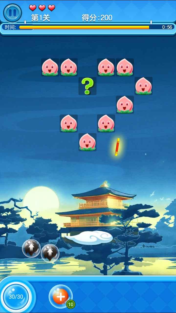 通过左右移动筋斗云,控制金箍棒打爆小仙桃。