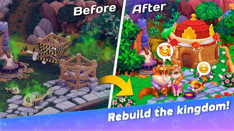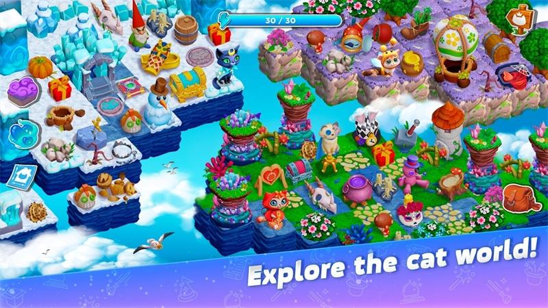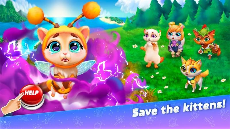 梦幻猫魔法冒险游戏以猫咪为特色,采用合成的玩法,玩家需要通过合成来帮助小猫恢复家园,进行冒险,打败邪恶的怪物,建立家园的设施,让这片家园里的生物越来越多,恢复昔日繁荣的景象,收集各种卡通可爱的小猫咪,与他们一起玩耍;