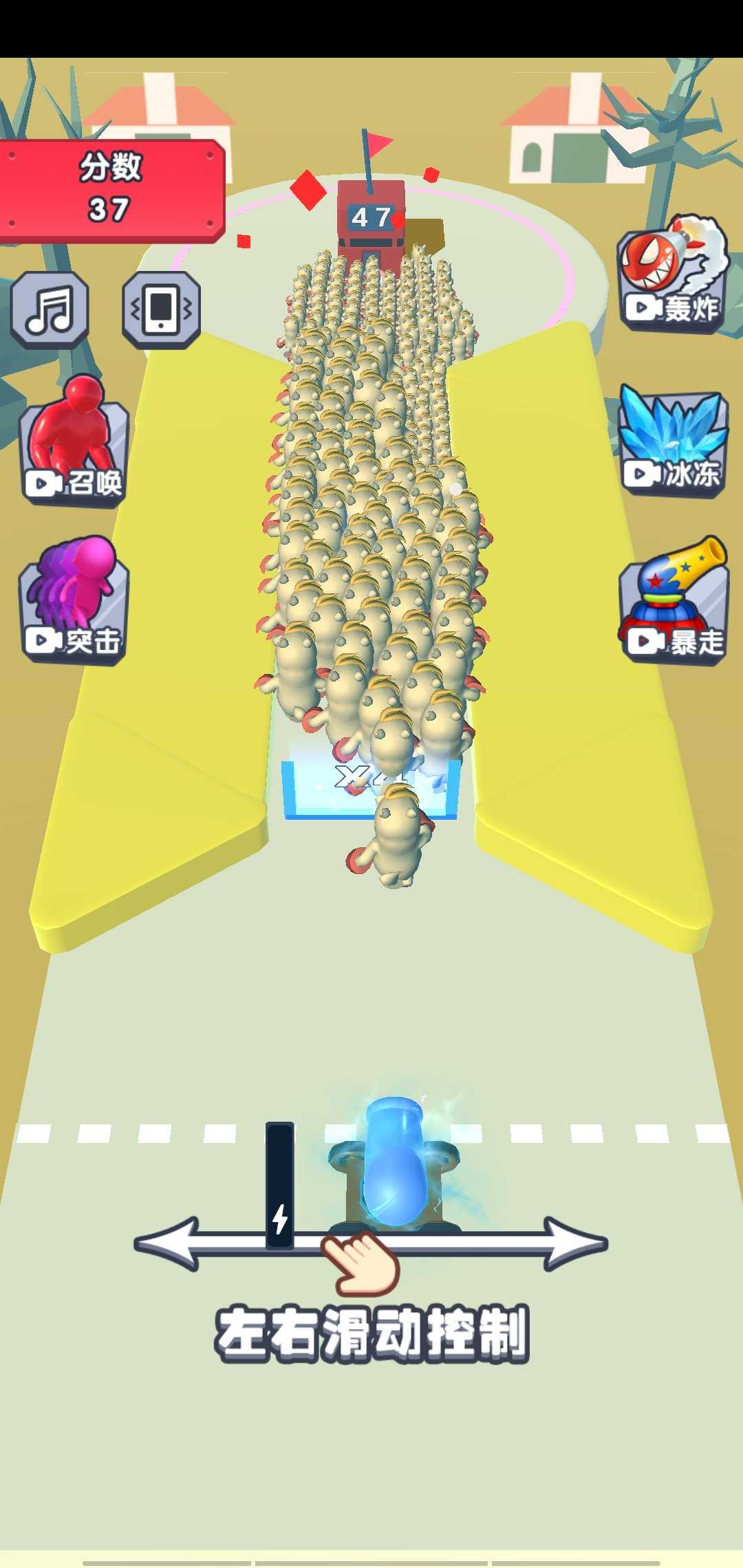 休闲射击跑酷竞技游戏,玩家在游戏中控制发射火柴人的火炮,在各种倍增门槛的助力下,抵挡敌人的侵略,赢取关卡的胜利。