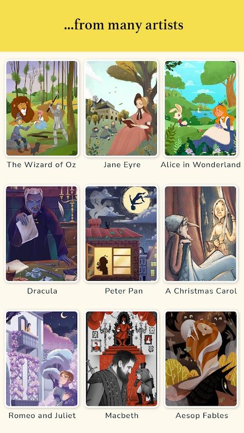 探索来自世界各地的不同才华横溢的艺术家的数百个精美的高清拼图。每个拼图都是一张华丽的多层手绘图来讲述这些故事。有了不起的盖茨比、傲慢与偏见、秘密花园、道连格雷的画像、爱丽丝梦游仙境、绿野仙踪、德古拉、麦克白、简爱、圣诞颂歌等等。