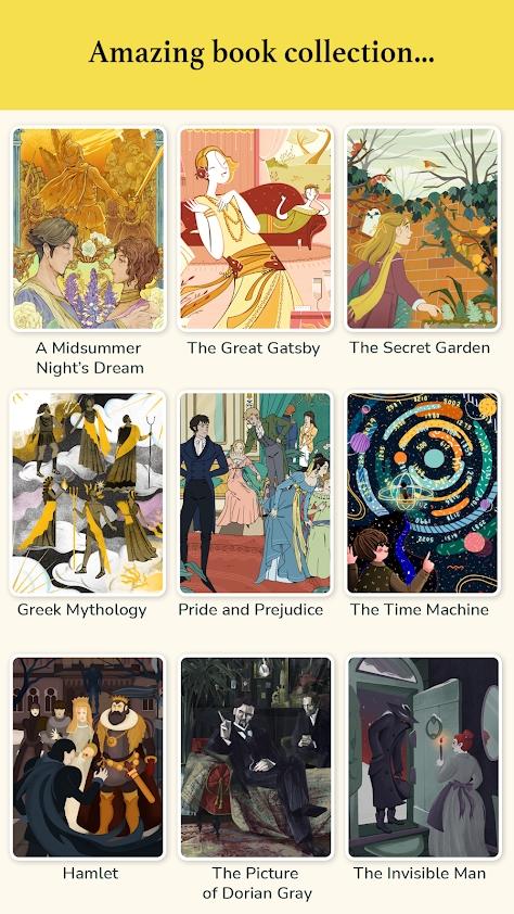 阅读一口大小的摘要,猜测物体的轮廓,并将碎片匹配到正确的位置,通过令人愉快的动画将盖茨比、罗密欧与朱丽叶、弗兰肯斯坦等宏伟故事带入生活。