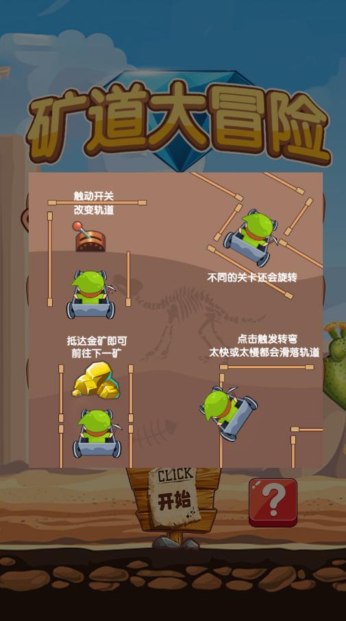 旷道大冒险作为一款受到很多玩家好评的游戏,非常的休闲益智,玩家进入游戏后需要驾驶自己的矿车在矿道中向前迈进,进行冒险,当需要转弯的时候就点击矿道上的机关,就可以改变方向了,当然,既然是机关,那玩家就需要掌握时间,要是太早或者太晚都容易闯关失败哦,因此,小心为上