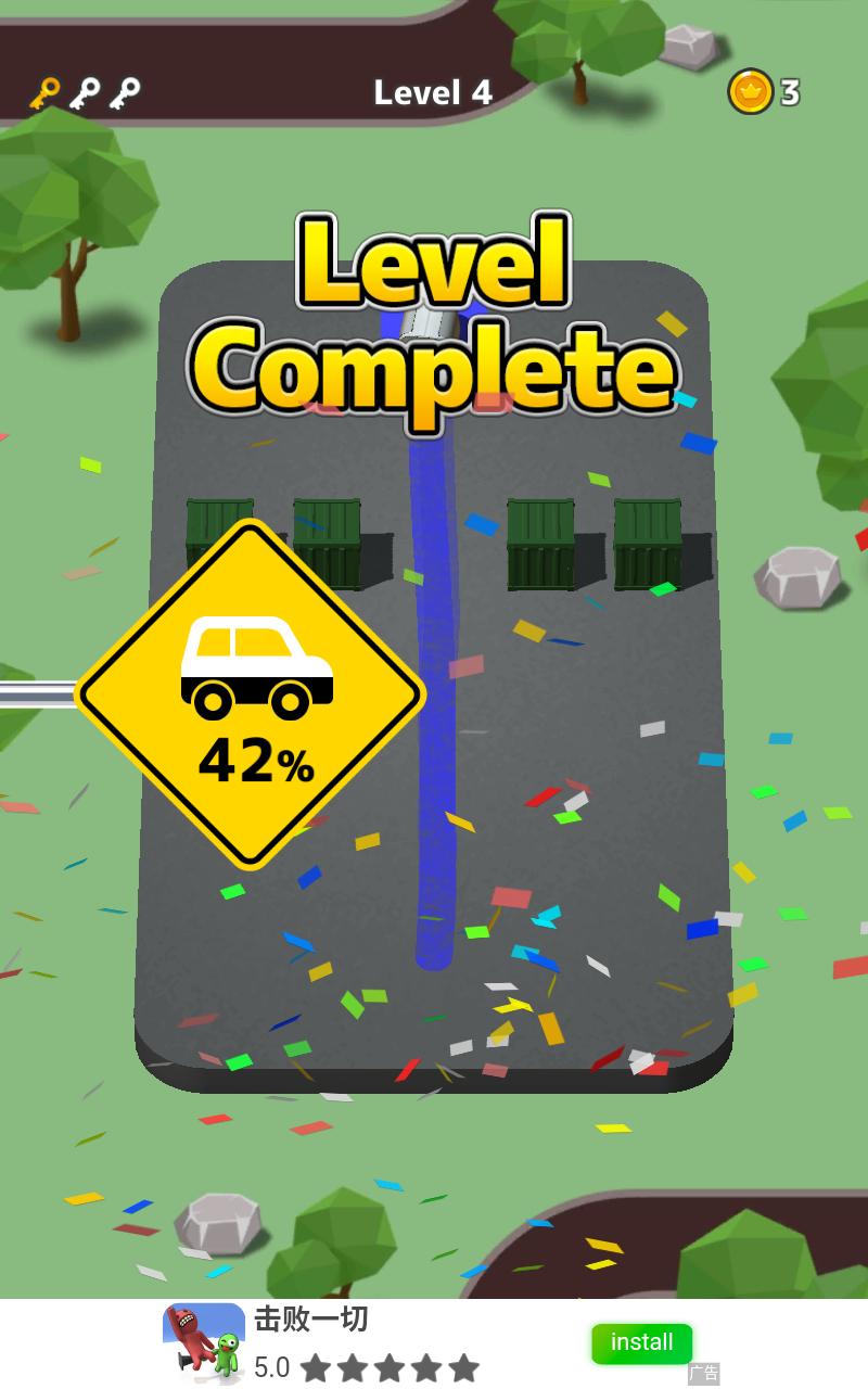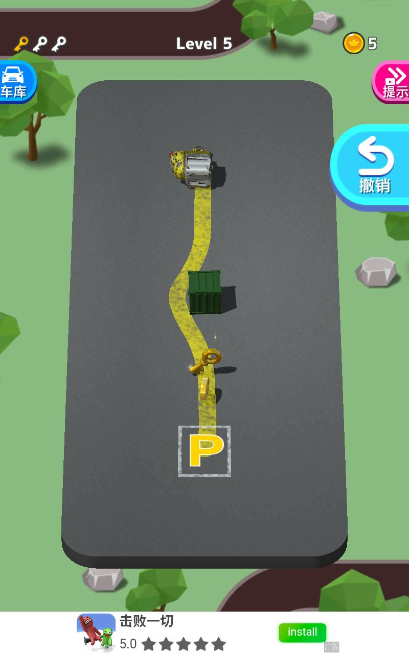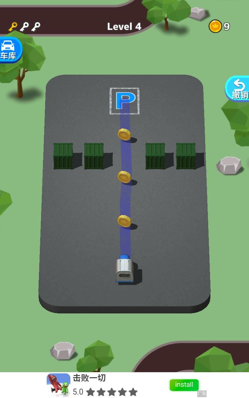 游戏采用方块式赛车模型,玩家滑动屏幕,使小车以最短的距离停到停车场内。