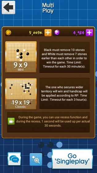 4、经典模式:以传统的规则在19x19格局中切磋棋艺 在多人游戏模式中随时可以稍坐休息。利用谷歌账户登录时提供业绩,并可以与设备联动。