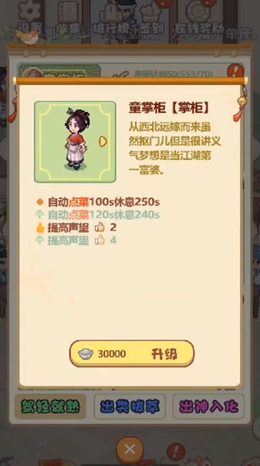 在夜晚培养你的厨师,研究与学习菜谱,提升客栈在江湖中的名声,吸引更多的客人到来;
