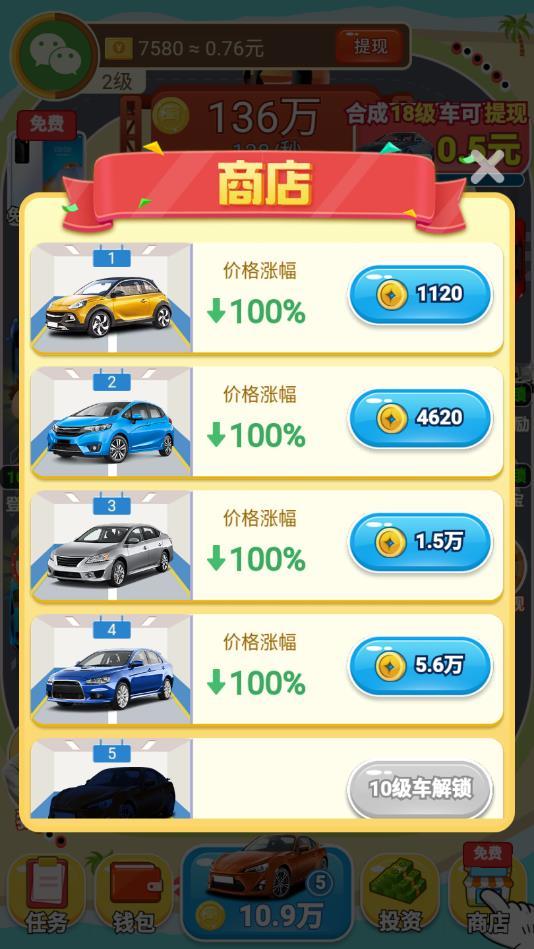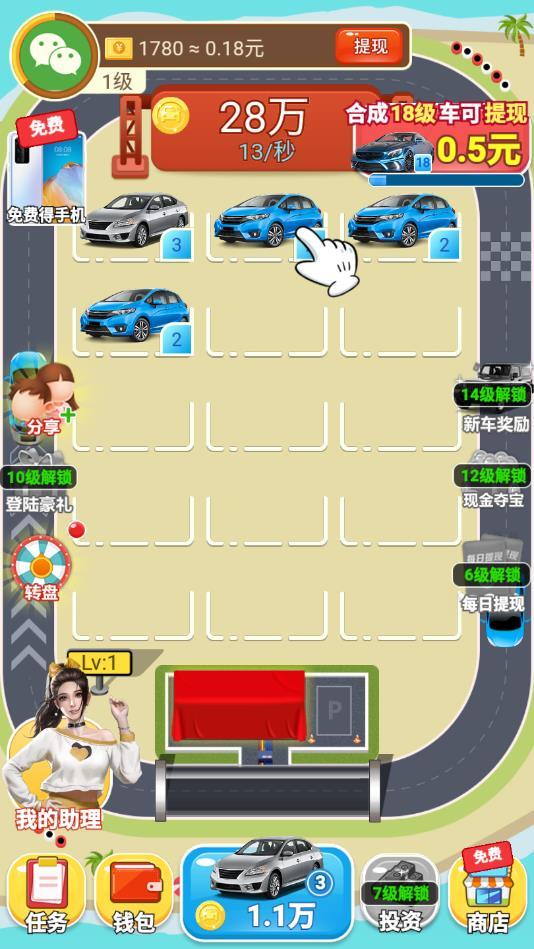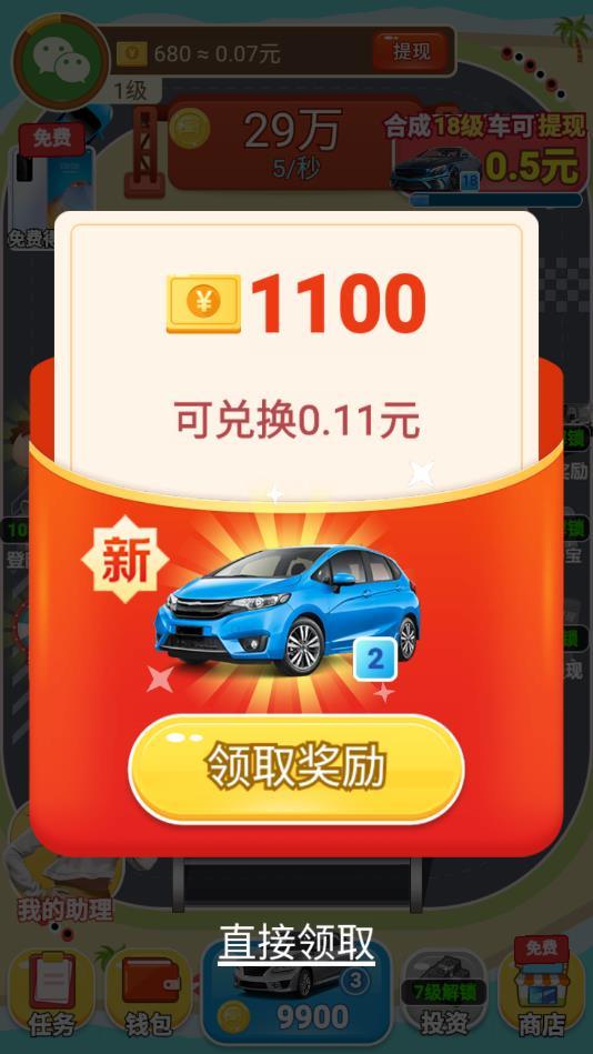 不断进行多样类型的汽车解锁的同时,还可以不断进行更多的金币获取,还有机会合成分成奖杯,每合成一个新等级的汽车就可以获得红包奖励。