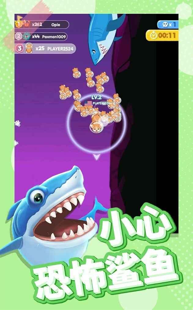 2.在游戏过程中,你需要吸引更多的其他鱼,把它们感染成和你一样的鱼;