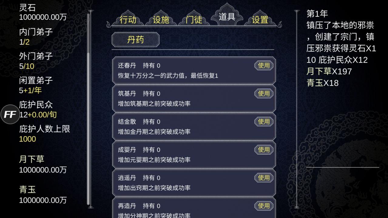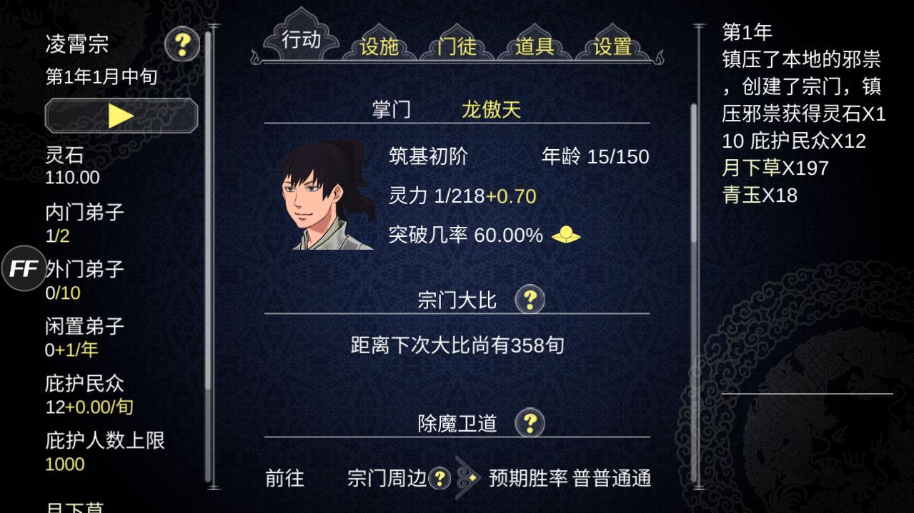 游戏的操作没有什么难点,不停的点击各项属性就能不断地发展宗门了
