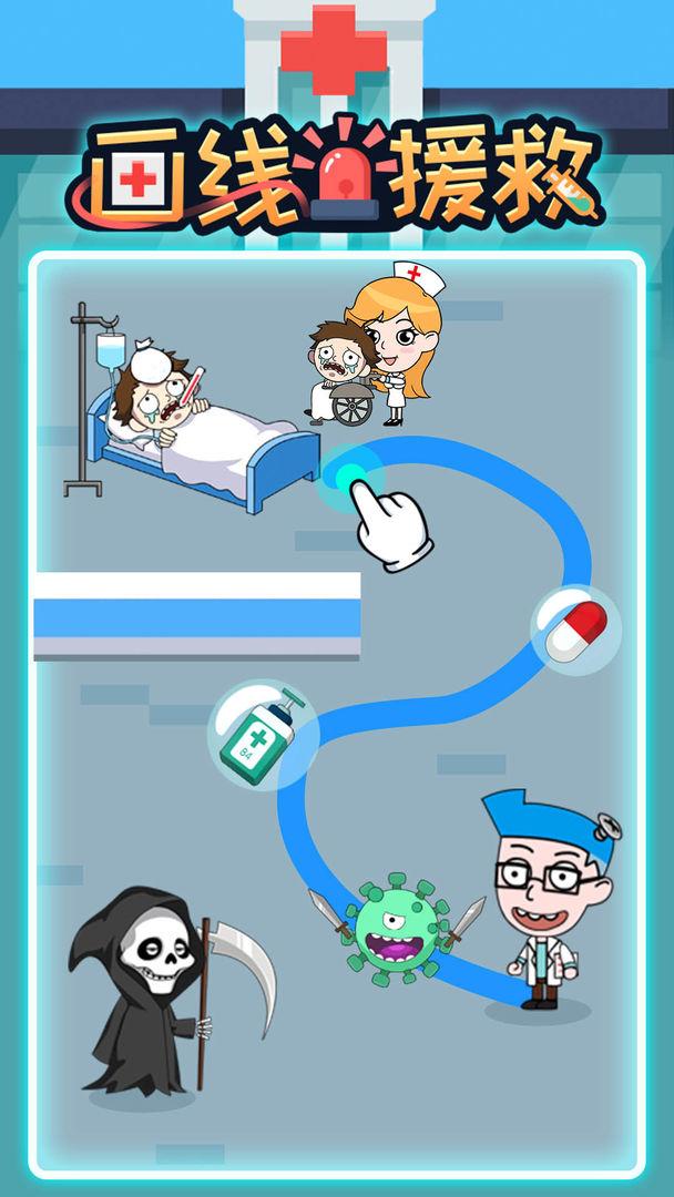画线援救是一款全新推出的休闲闯关小游戏,游戏的操作非常简单,设定非常的新颖,在这款游戏中你需要做的就是合理设计线路避开死神和病毒的侵袭,用药丸去拯救病人。