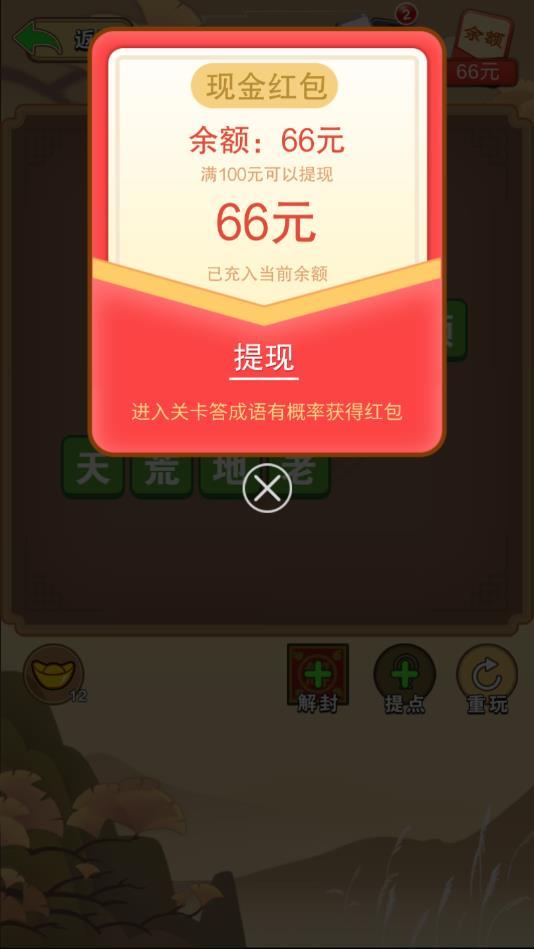 玩命猜成语是一款非常精彩的成语闯关游戏,海量的成语资源,以闯关的方式进行多样成语的学习以及温故的同时,也可以进行红包的赚取,每次闯关成功,都可以获得红包奖励,玩法是非常有趣的,让你娱乐赚钱两不误。