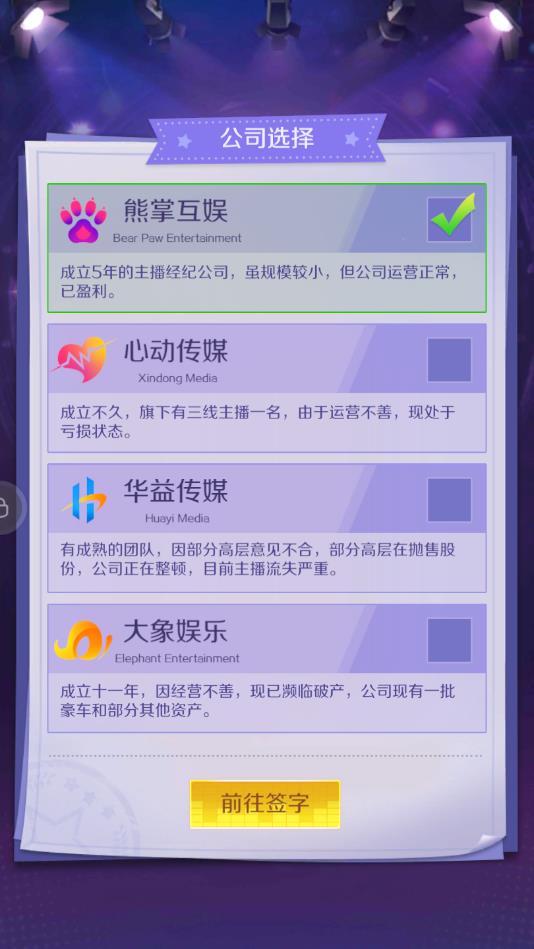 主播经纪公司是一款以主播为题材的模拟经营类游戏,自由进行多个不同类型的主播公司的购买以及轻松进行多个主播的签约,支持进行主播的升级以及装备的配置,通过挑战的方式让主播得到提高,每一关卡都能够获得相应的奖励,支持进行多个平台的合作。