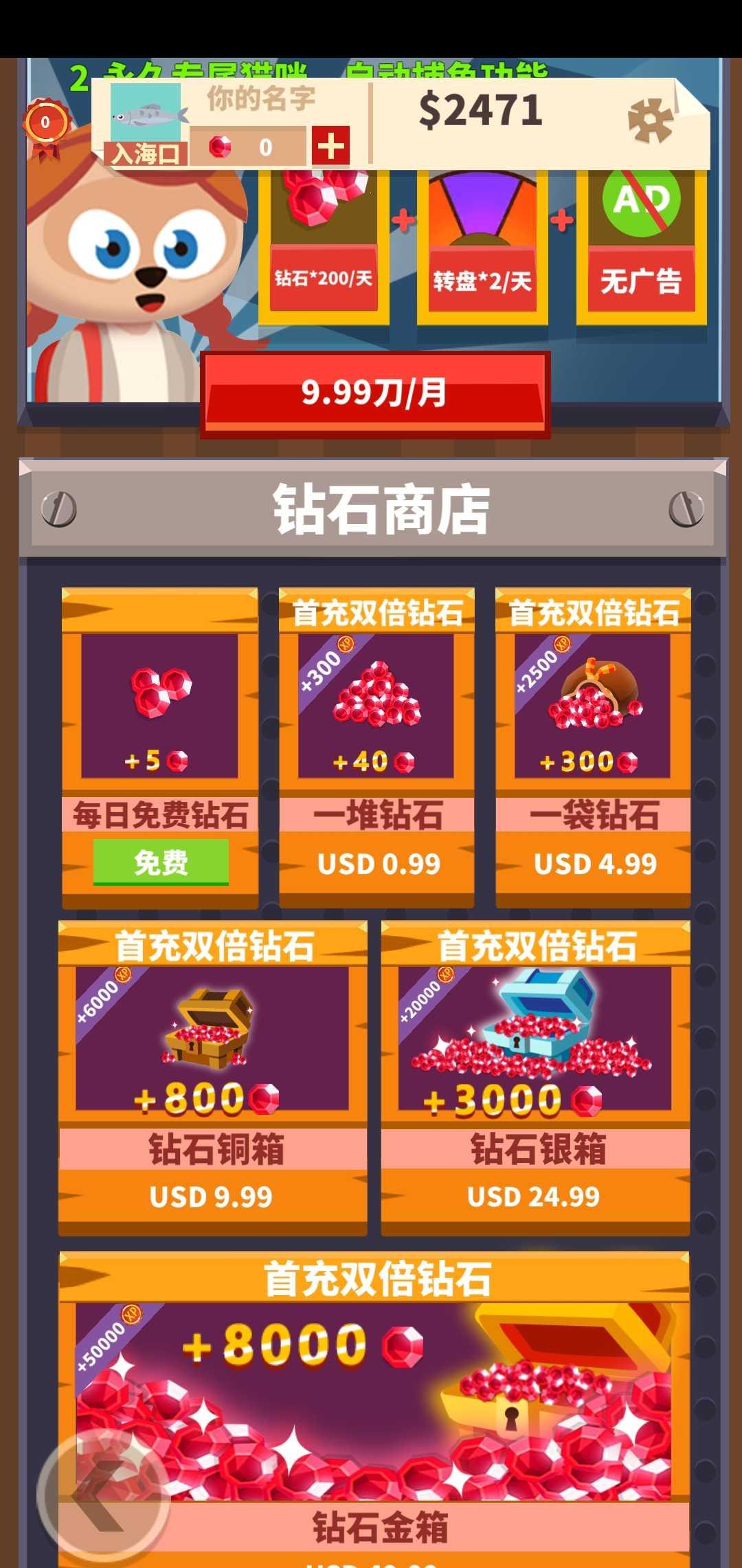 猫钓公司游戏已经修改成了免广告获得奖励,这是一款非常休闲的钓鱼游戏,在游戏中您可以扮演一只猫前往各个海域钓鱼,鱼的种类非常多,越是难以到达的海域里面的鱼类就越珍稀,解锁不同的鱼竿和升级装备能够让您的钓鱼变得更加轻松;