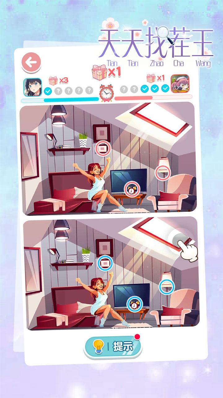 天天找茬王手游和我们平时所接触到的找茬类型的游戏不太一样的地方是游戏中增加了超级可爱的美少女立绘角色和多样的换装系统,将找茬和换装两种游戏的模式一起带给大家,让你能够体验多重的玩法模式,通关找茬关卡就饿能给我们的角色换上新装,打扮成你心中理想的样子。
