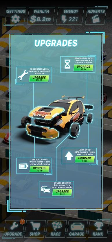 合并汽车安卓版,游戏的玩法非常的简单,你需要通过合并的方式进行各种赛车的升级,游戏中包含了大量的知名GT赛车,你可以不断地获得新的零件或者是装饰来让他们变得更快更强,在比赛中赢得最后的胜利。
