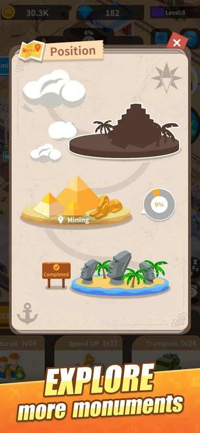 根据文物考古的故事主题,设计了探测,挖掘,清理,研究,以及烹饪5种全新的职业类别。建设你的考古队并激励你的队员,你将赢得奖金,升级营地。还可以对建筑进行修复,搜索古代文物和线索,你需要寻找失落的钻石,去揭示远古传说。