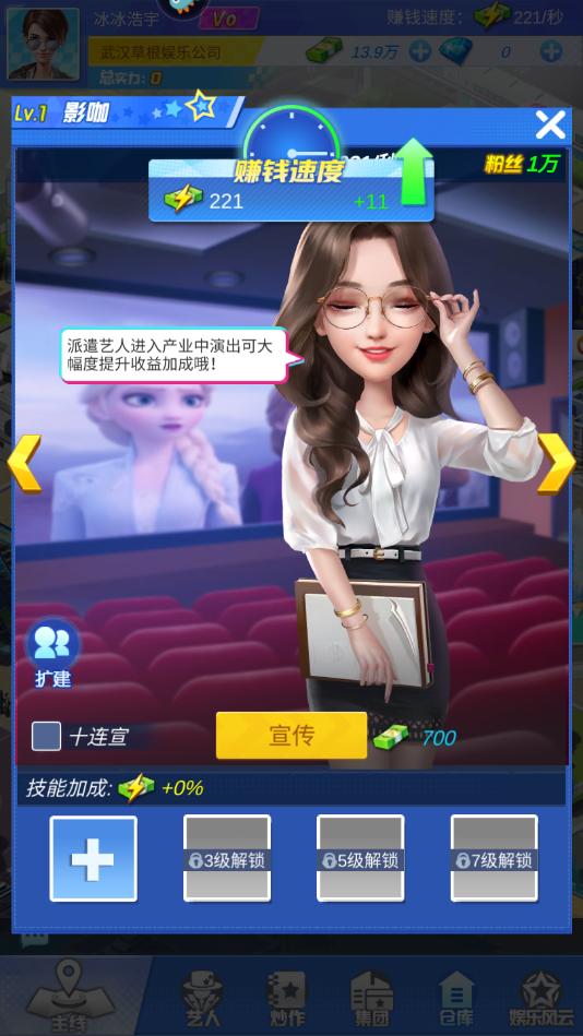 当然艺人的这个技能也是可以通过后期的升星来进行升级,像【胖迪】的这个技能就是万金油,当然优先派到最能赚钱的建筑去啦~