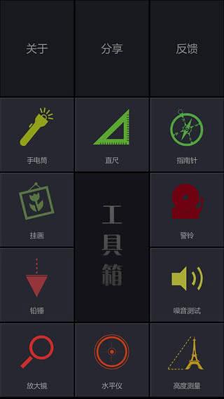 这是一款集成了很多实用又有趣的功能的手机工具,包括了基本测量,手电筒,指南针,水平仪,铅锤,噪音检测,距离测量,警报灯,挂画角度提示等诸多强大的功能,一定会给您的生活带来极大的便利和更多的乐趣。