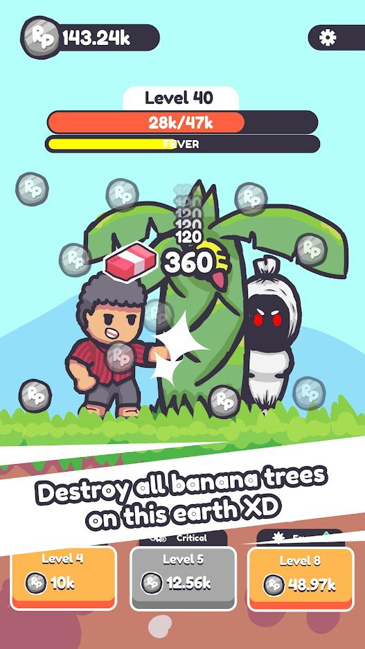 打树狂人是一款非常魔性解压的小游戏,玩法非常的简单,而且目标也就一个,就是不断的控制角色去击打香蕉树,获得资源来强化角色,这样就能击打更高等级的香蕉树,还能够解锁各种不同的角色来玩,这款游戏一定能够让您感觉到放松。