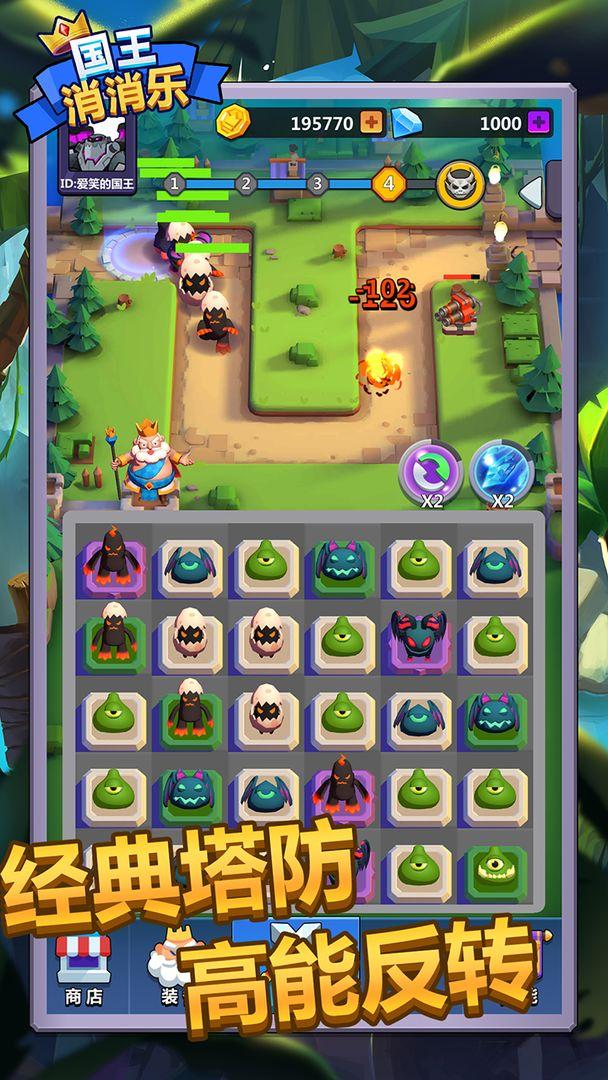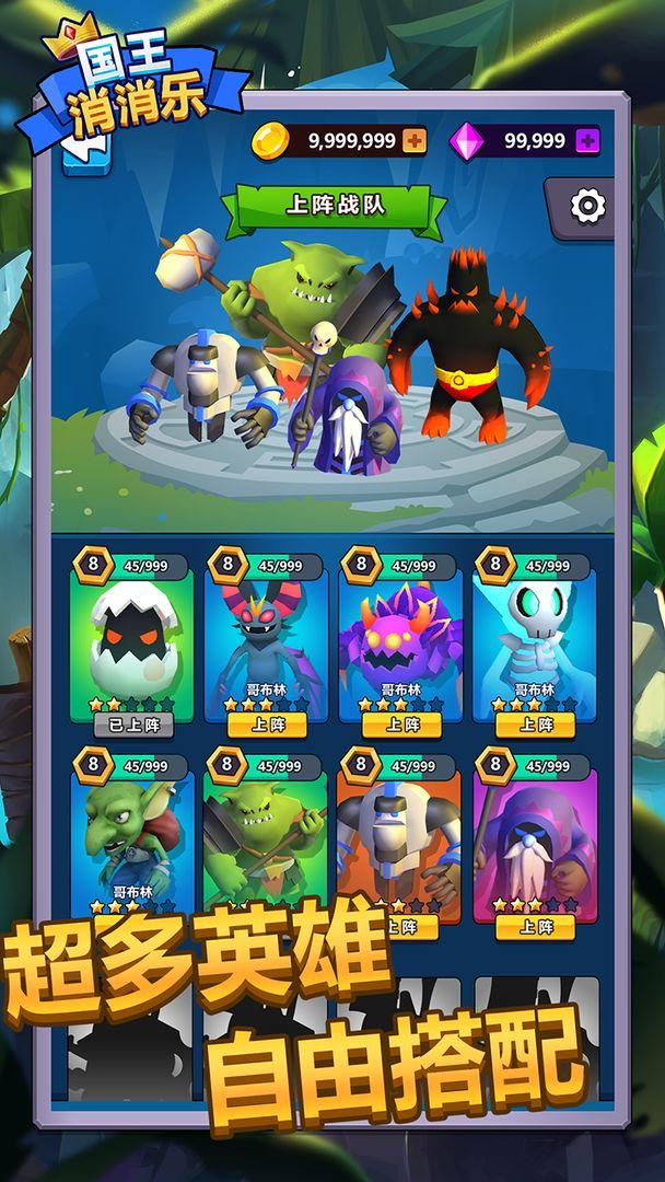 国王消消乐游戏给大家破解成无限的金币钻石和突破石,这是一款三消玩法的塔防游戏,通过消除来获得伤害击杀敌人,解锁各种强力的英雄帮助您更快赢得关卡,许多的技能可以搭配使用,玩起来非常的简单有趣,还有各种装备任意让您搭配哦;