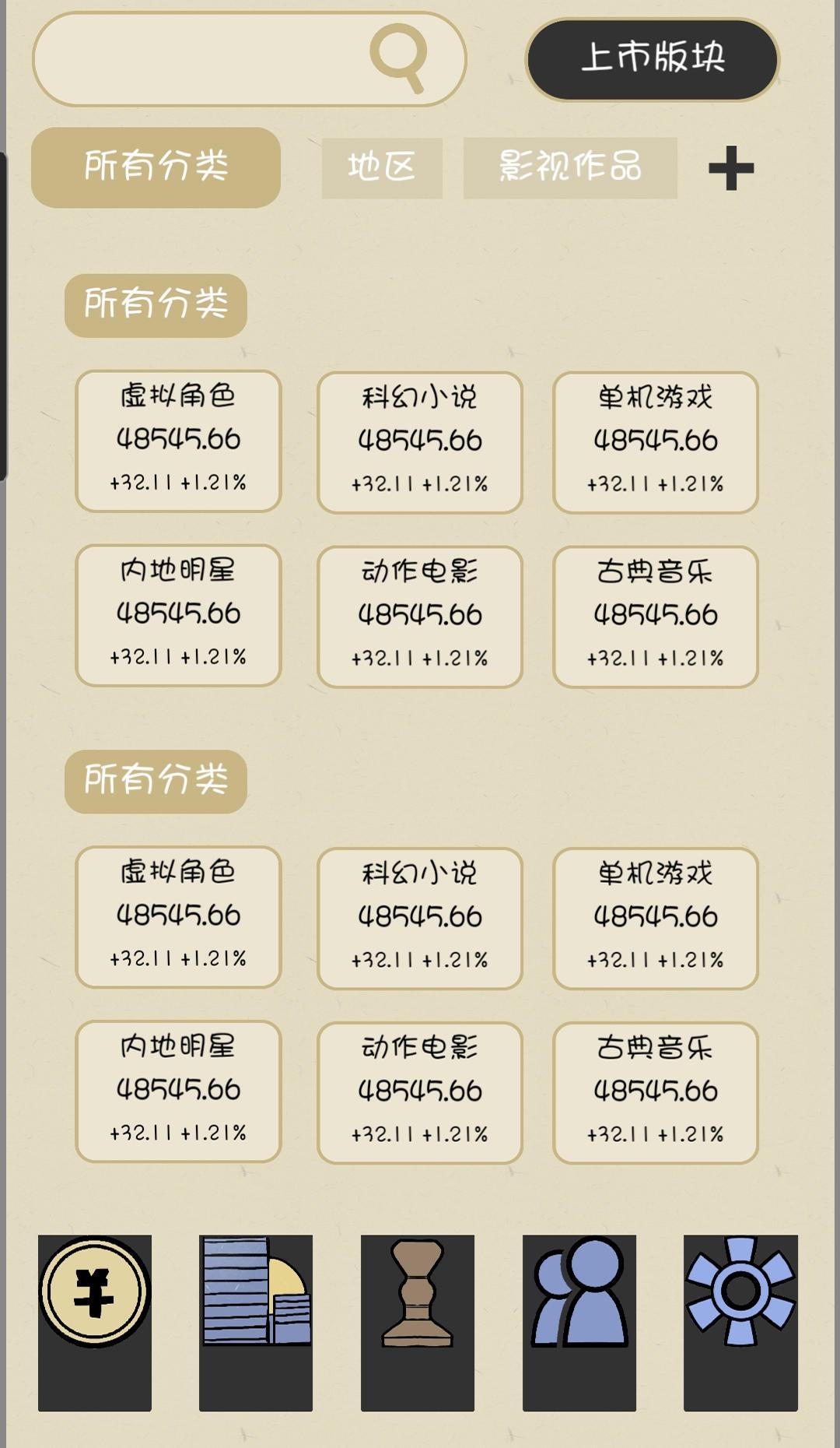 文字的价值中文版将所有的文字都带入到一个价值体系当中来,玩家们可以选择自己看好的词语进行投资,比如虚拟人物,科幻小说板块,历史名人等等,将所有的汉字都赋予了相应的价钱进行跟进卖出的操作,最后获得收益。