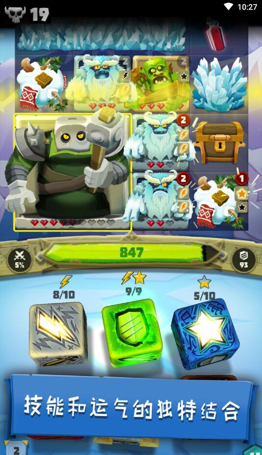 你所使用的骰子的综合防御(短的防御)值决定了你所掷的每一个盾能被多大的伤害。每个盾牌所阻挡的伤害的确切数量显示在健康棒的右边。在以后的关卡中,敌人会变得更加强硬,所以你要不断升级你的骰子!