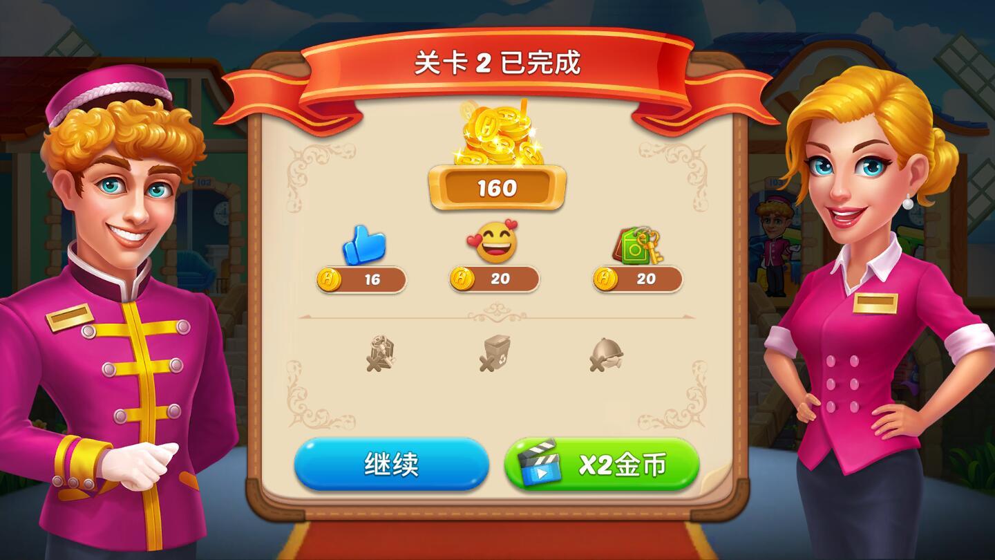 收集硬币,宝石和喜欢物品以升级酒店故事游戏。