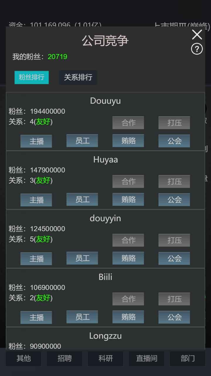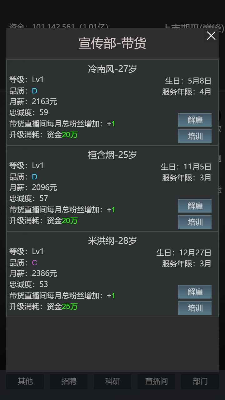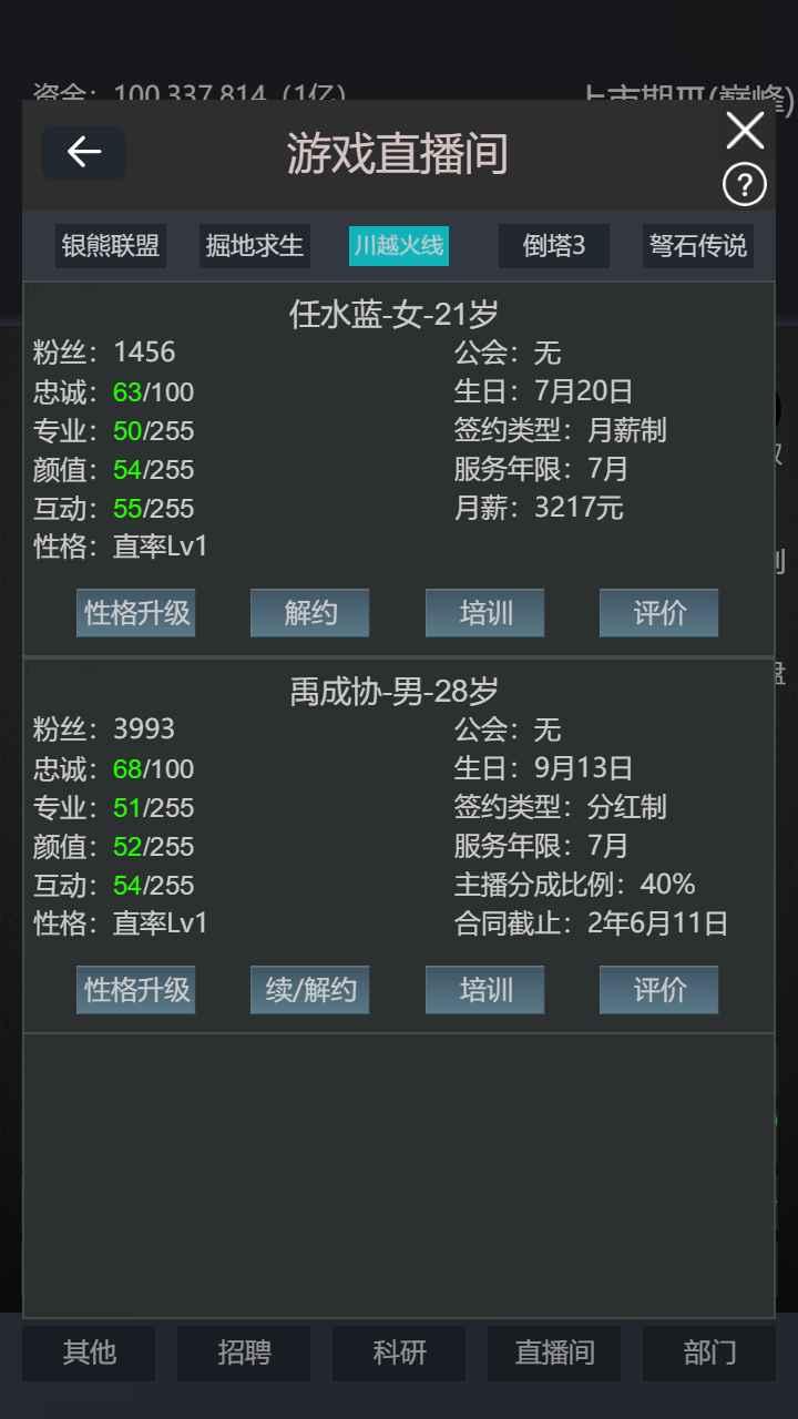 1.主播:需要你签约不同类型的主播,不同的主播职业,性格等很多因素都不一样,所以主播的搭配管理需要你来控制,从而得到最大化的收益