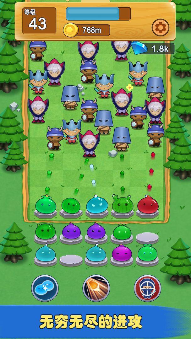 2、保卫森林的资源,把两个同等级的史莱姆进行合成,获得新的角色;