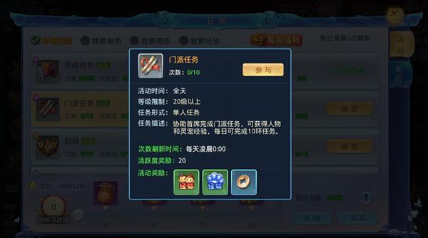 当玩家等级达到20级时,可在日常活动页面-门派任务中进行接取。门派任务分为十环,每完成一环门派任务都可获得丰厚的经验奖励,完成10环任务后更可获得荣誉徽章奖励。