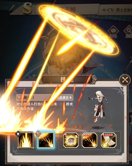 对全体敌人打出5段伤害,造成120%的光系魔法伤害。