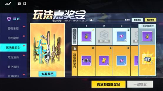 战士们可以在“活动-玩法嘉奖令”中领取对应等级的奖励,玩家可以购买玩法嘉奖令中的特别嘉奖令解锁更多奖励。奖励包含枪械碎片任选箱,紫色套装,活动印记,头像框,聊天气泡,珍藏补给券,枪械补给券等道具。
