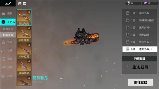 仓库-工坊-枪械改造界面新增骇龙升级,消耗骇龙核心和时装碎片即可升级骇龙-P1,最高可以升级为黯炎骇龙。