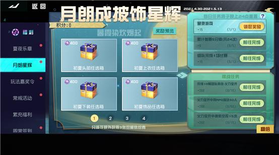 活动期间登陆游戏前往“活动-月朗星辉”即可查看当前任务,完成对应任务即可获得初夏积分。在“活动-月朗星辉”界面消耗初夏积分可兑换奖励。