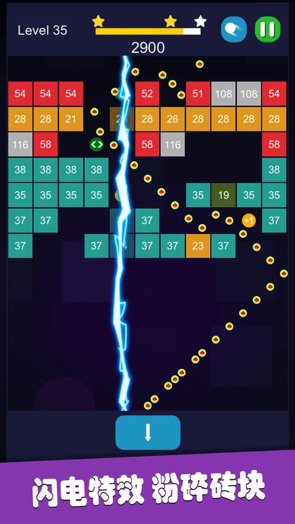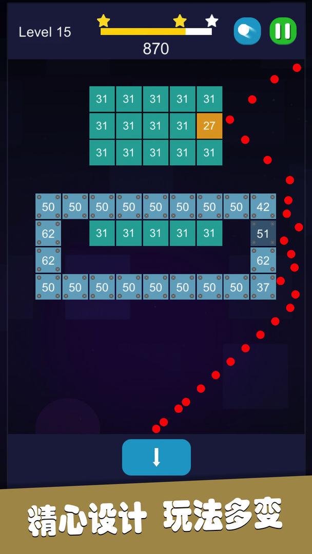 2.经典的玩法模式,点击屏幕,左右滑动,瞄准砖块发射,击碎砖块。
