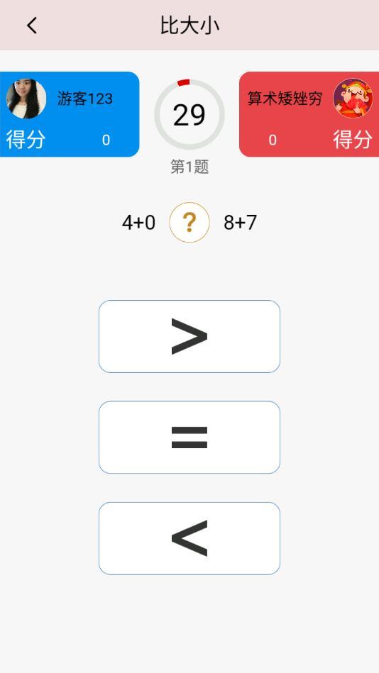 算术大比拼是一款经典的算术游戏,玩家需要算出来两个题目得出来的结果大小,您算得越快,分数也就越高,快来挑战吧,都是一些小学算术题目,很适合小孩子来玩哦,可以锻炼小孩子的数学能力,看看您能不能赢得对手;
