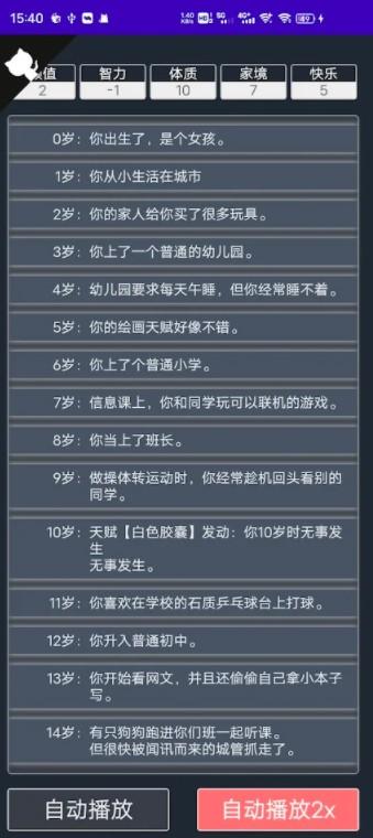玩家根据个人想玩的走向来选择天赋,比如修仙的话就要刷“神秘的小盒子”,想要变成魔法少女就要刷“魔法棒”,不同的天赋有可能会开启不同的人生经历。