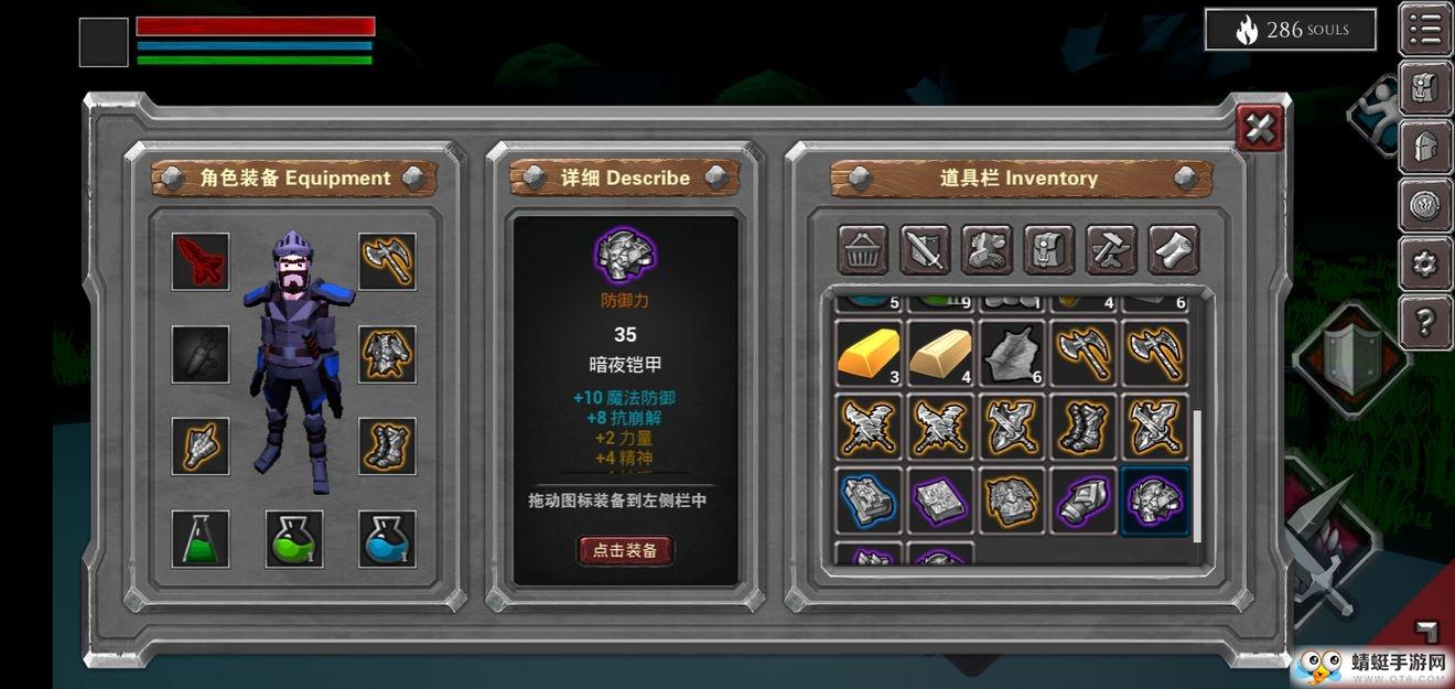 主要是挡boss技能。商店要打过刚骑才能刷到稍微好点的属性。前期刷炎骑士,得到皇家骑士套装,以及几件加精神的装备,副武器推荐斧头,技能蓄力冲刺和加攻击那个,其他个人喜好。要是那些属性高的武器留着,管他什么颜色,用来穿要求高属性的武器。有几件装备了可以试下打蜘蛛,要是很轻松秒掉boss,就刷一些技能,治愈,专注,但必须要有加攻击力的,不然刚骑砍的超辛苦,总以为最后两刀能搞死他,结果被反杀。过了刚骑,就升级商店,去前两关赚钱,觉得攻击力够了,就去刷刚骑弄到恶意咆哮技能。买到防御力高的,或有把蓝色片手剑就去刚第五关。如果没通过第五关,一般打到他升天,第一波发激光时,往向右走打不到你,只要你满血,第二波激光可以吃下不死。要是你攻击力够的话,打完他的四只光球后就能秒了,不给它上天机会,每个光球要打5下,不关攻击力的事。然后就是打第六关,只要留点钱复活这关过了,你就可以升级商店刷神器。此时你回去打刚骑刷钱,顺便刷被动技能,推荐必杀,暴击率。要刷出一件加5精神的紫装,其他要防御高的,因为升级了商店,boss攻击力都变高了,真的就5下,要你回家。副武器片手剑推荐要有挡五次攻击的技能的,没有用斧头,斧头随便,只要你获得了恶意咆哮技能就行。主武器一定要刷出橙色长剑带神技的,不然那两兄弟帮捶打砸手机。有了神剑,刷第五关是最赚钱的,打了boss四分一血就可以放大招,一般都能把他烫死。记得要把那些加力量和耐性的防具留下,,不然你穿不上橙装。长剑好像是要力量跟技巧20,片手剑很多都有加10以上技巧的,换装备时切换到片手剑可以了。蛮王想怎么打你喜欢,有钱就去买武器,双刀斧头,长剑都可以随便穿随便用