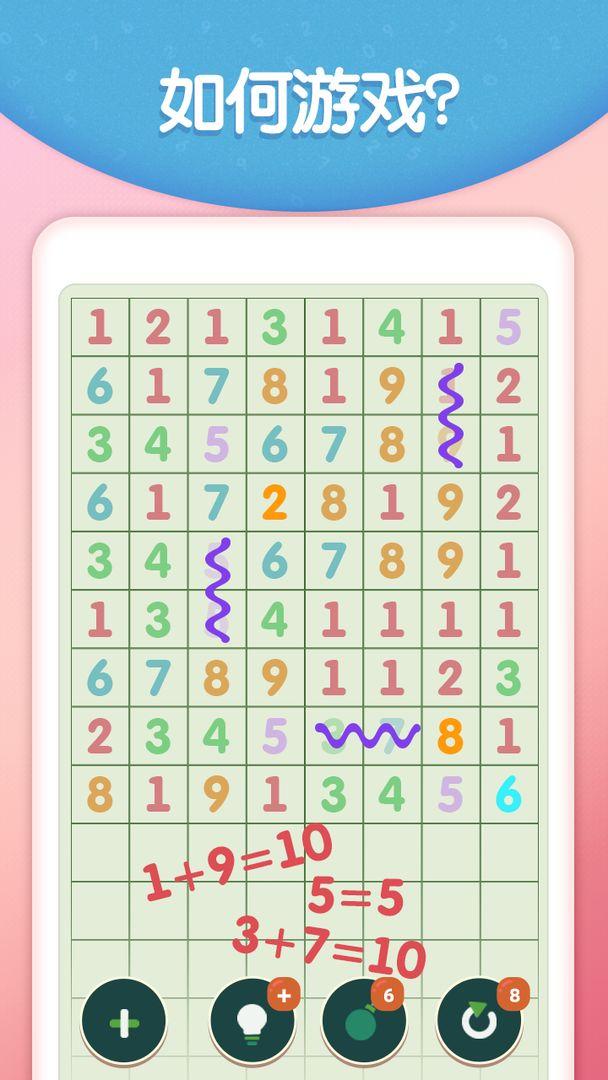 4、休闲模式:除了规则匹配的数字外,你还可以将两个数字之和小于10的相加组成新的数字。