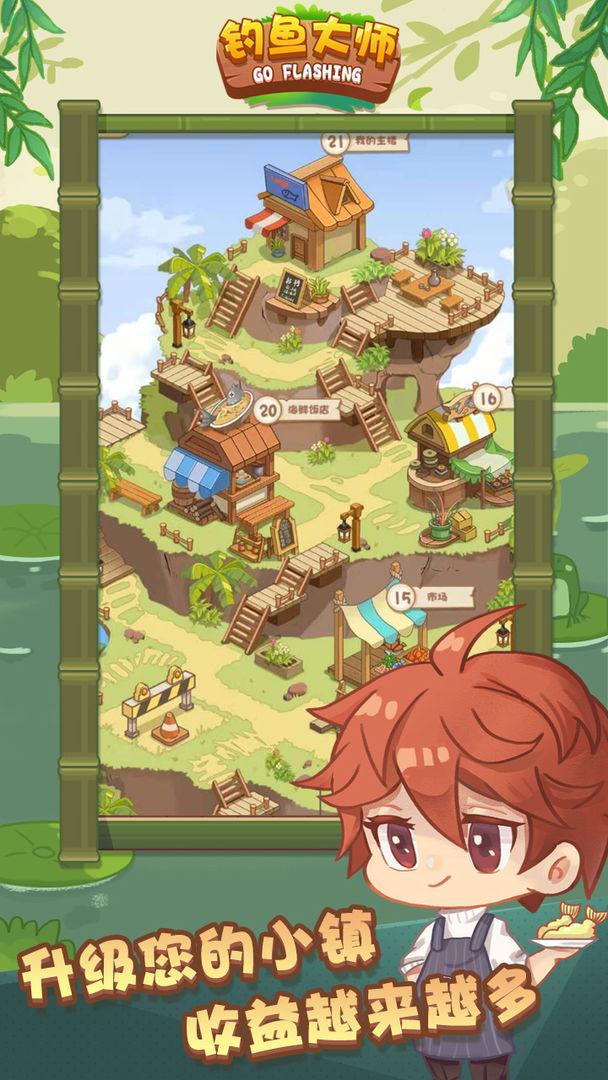 《钓鱼大师》是一款休闲模拟经营类游戏,经营开放自己的渔场,渔具店,饭店等增加收益,参与游戏内设计的各种玩法,完成任务,升级建筑,解锁各种场景和鱼种,渔具,菜肴等,获得积分,分享奖励。
