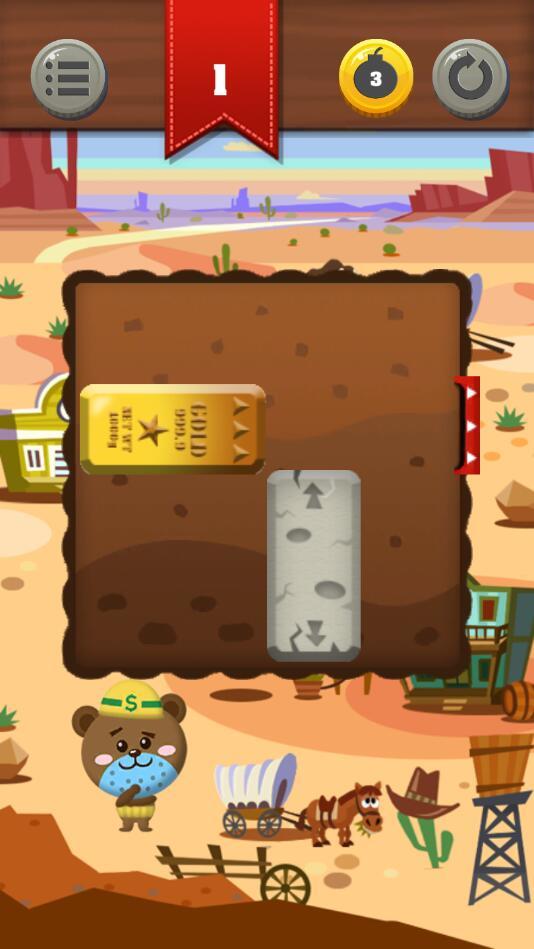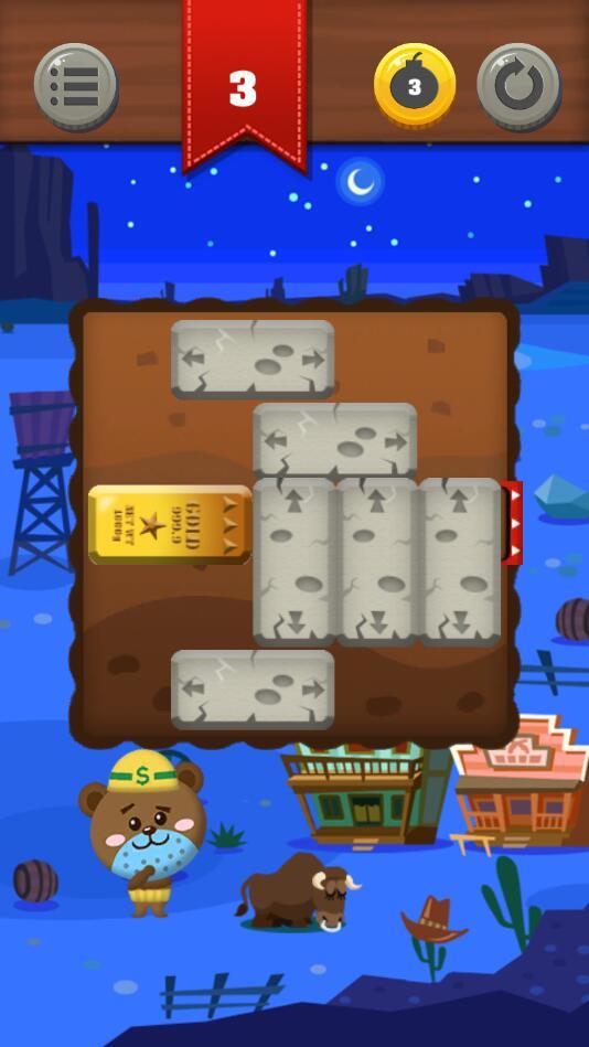 金块拼图是一款有趣的滑动拼图游戏,玩法规则易懂,但是挑战性很强,玩家需要滑动石块,留出一条道路来让金块可以移出去,游戏的关卡非常多,而且难度是一点点提升的,有道具可以使用,如果您无法通关,就利用道具击碎石块吧;