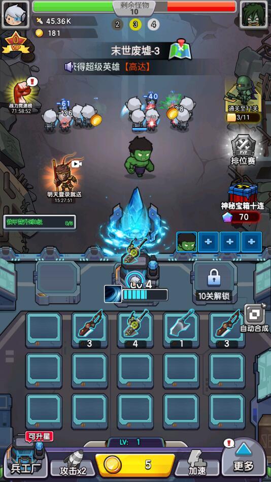 末日黎明游戏已经破解成了免广告获得奖励,这是一款放置合成的游戏,以末日为背景,玩家需要合成各种武器道路来消灭敌人,解锁许多的英雄来让自己的实力加强,获取资源建造营地,玩起来轻松休闲,打怪过程很是解压;