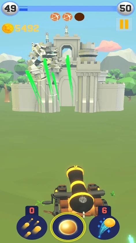 城堡爆炸破解版是一款卡通风格的射击类休闲游戏,游戏不需要你过多的操控,因为你的角色不会被其他的npc干掉,我们只需要一门心思的思考如何使用大炮完美的将城堡击溃。炮弹的数量有限,不要浪费哦。玩家需要对物理有一定的了解,更好的找到力学支点,炮轰它。