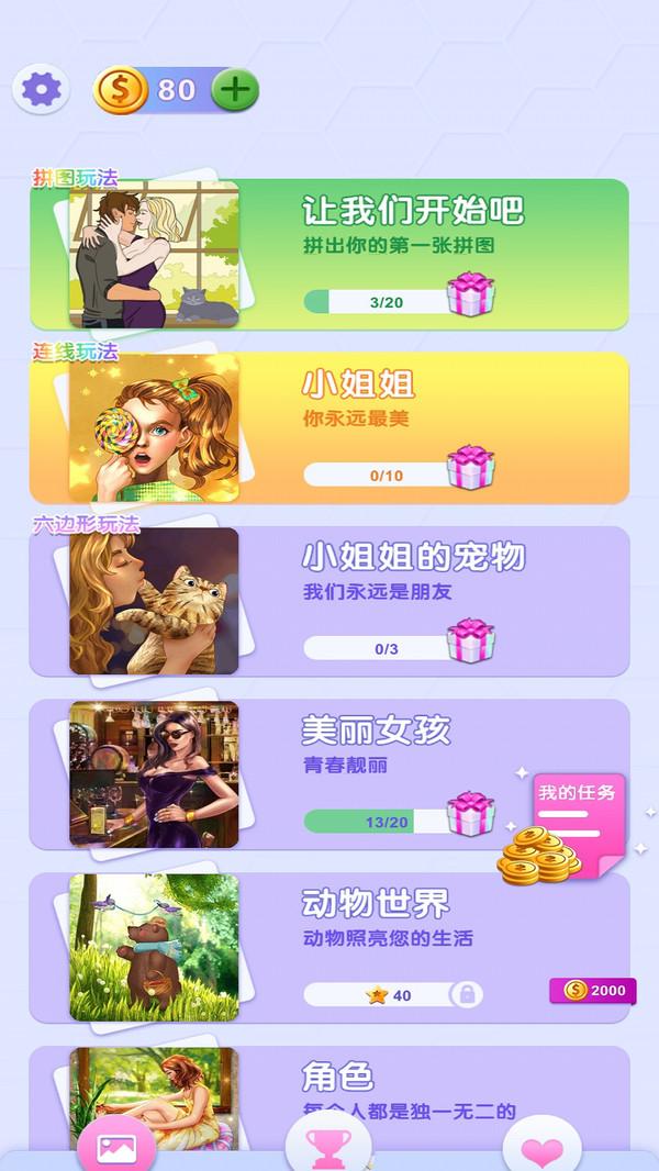 作品涵盖人物、风景、动物、星座、世界等多种主题,每完成一件作品将获得相应的金币奖励。