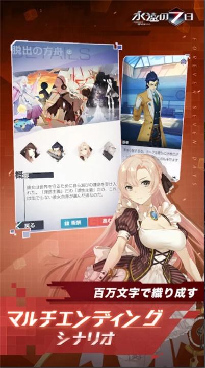 永远的七日之都,这款游戏可以说是放暑假的同学们最好的消遣时光的游戏了,因为这款游戏具有多种多样错综复杂的剧情分支,游戏的类型类似于单机玩法,过剧情的时候会有多种选项让你选择剧情的走向,在打通某个结局之后,游戏会重新开始,然后再来一遍,能累积下来的,只有角色以及战斗力和装备,第一次打通就叫做一周目通关,第二次打通就是二周目通关,如此累积,游戏内的自由度非常高,不过建议新手玩家在开始游戏时,最好去找一些攻略,看一下一周目先完成哪个剧情比较好,因为不同剧情获得的人物不一样,后续有的剧情是要求一定条件才能触发的,所以一开始我建议先打安线和安托老师会比较好,这样子高周目就可以随便玩了,想攻略哪个女主就攻略哪个,开局还是比较重要的,那么在游戏进行到后期以后,系统还提供了许多联机玩法,类似于阴阳师的一些活动,所以后期所有剧情都完结之后,还是有许多可以玩的。