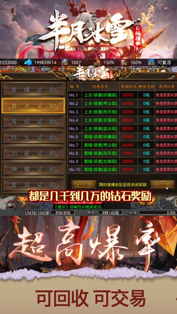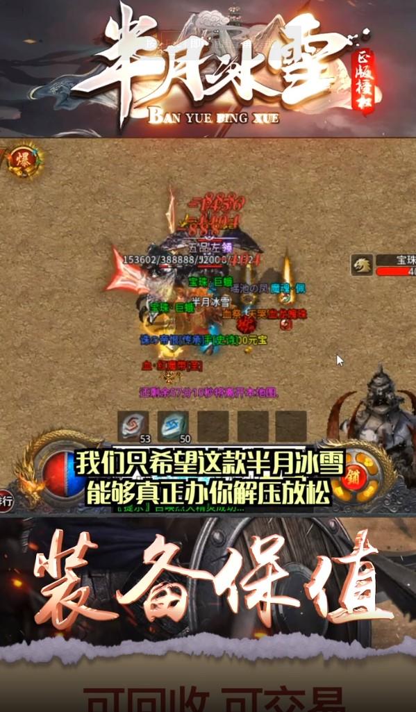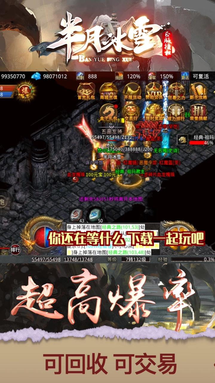 2.半月形传奇冰雪版游戏爆率超高,杀人爆衣,最好的神衣等着你去拿。