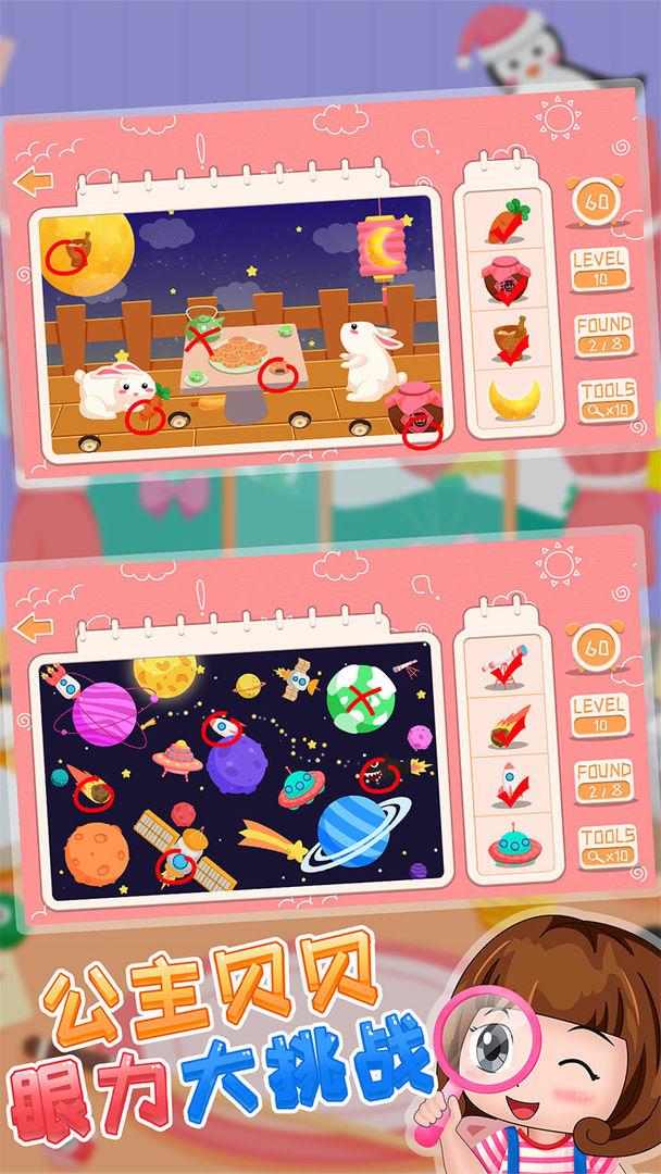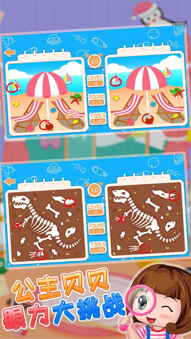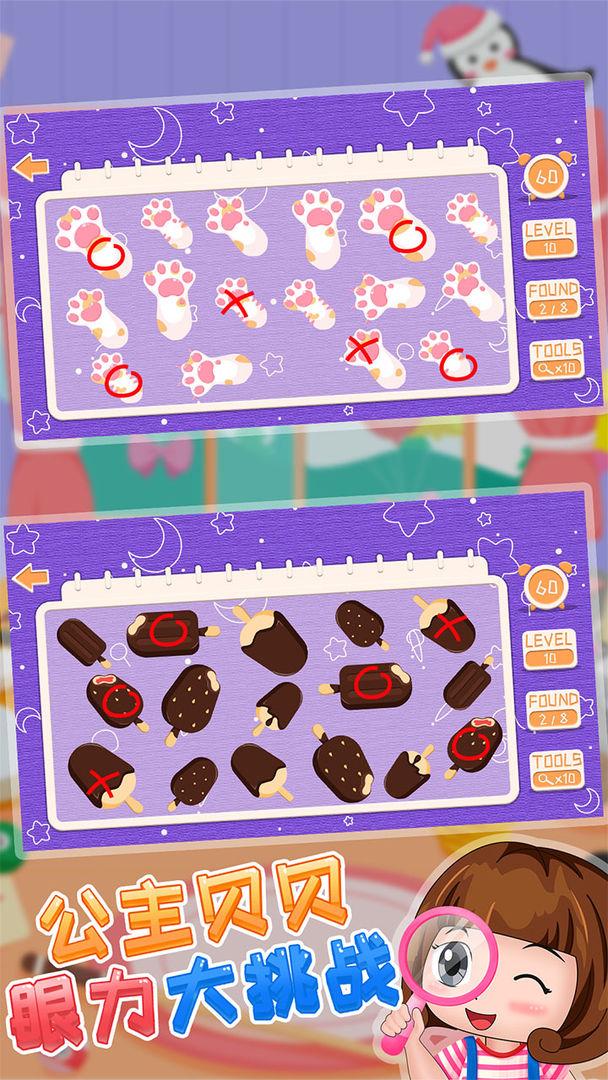 公主贝贝眼力大挑战是一款非常考验大家眼力的休闲益智小游戏,游戏主要是面向儿童朋友的,玩法非常丰富,包含找茬,找相同和找不同的玩法,非常锻炼小朋友的动手能力和脑力,快来试试吧!