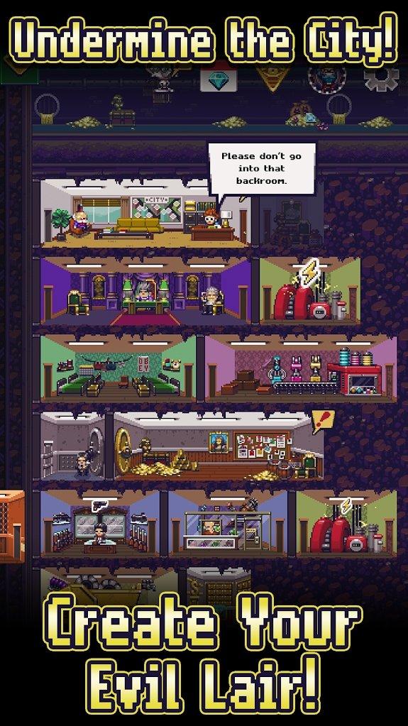 空闲策划者是一款关于养成经营类型的游戏,玩家将会成为一名反派,玩家需要在游戏中不断的建设自己的势力,招收各种暴徒,建立各种建筑,不断的打败各种超级英雄,收集各种各样的武器装扮,提示自己的战斗力。游戏中会有超丰富的科技研究选项,不断的强化这些科技研究,成功建立最强大的邪恶的帝国。