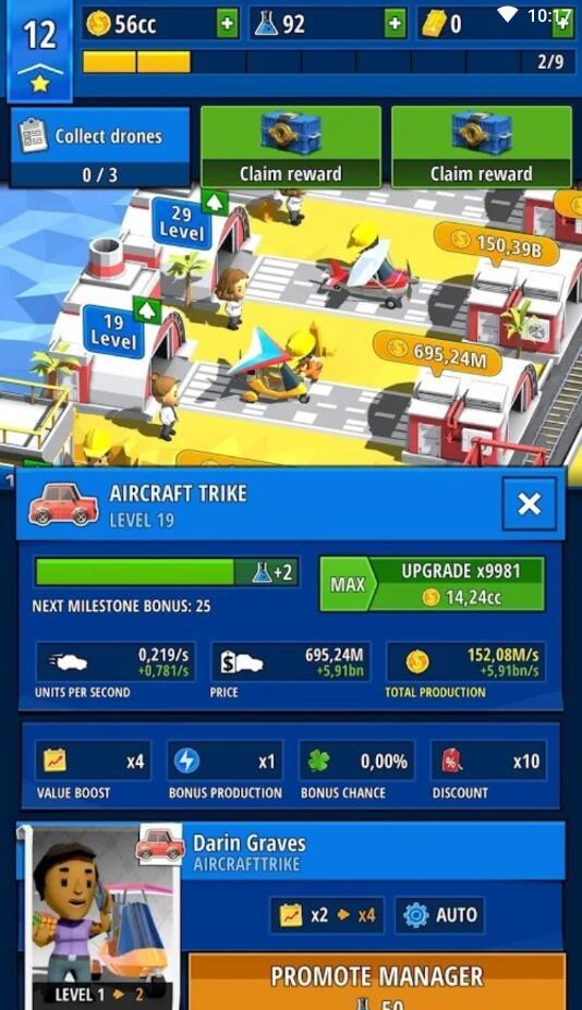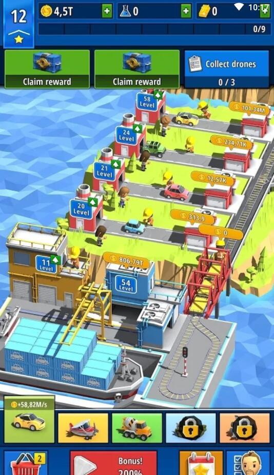 2、合并车辆升级,赚取丰富的金币,将你的流程全部半自动化,赚钱更快。